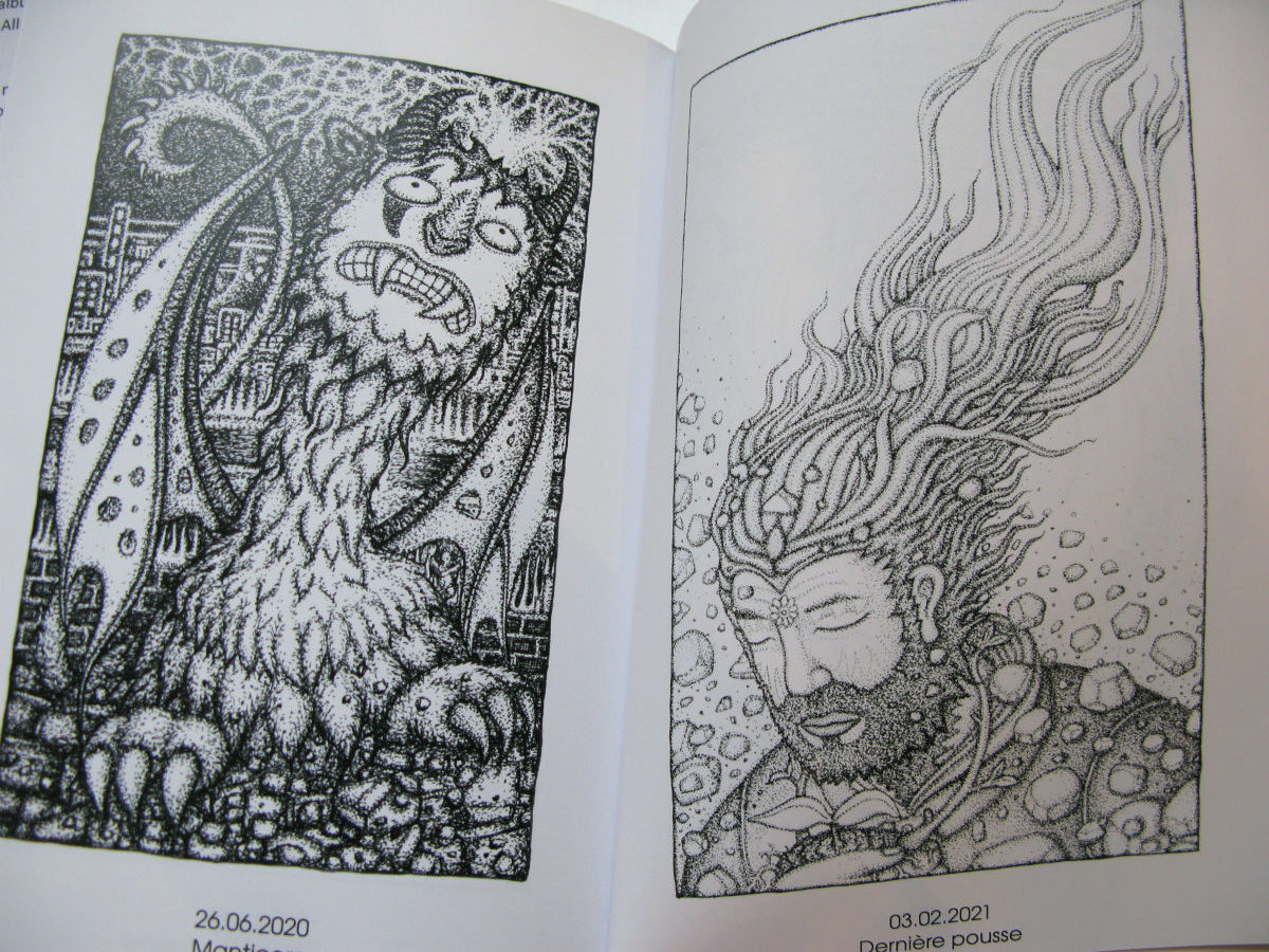 Marée de 57 encres noires, graphorrhée où les traits se succèdent à un rythme effréné et incisent la chair du papier pour ouvrir une saignée dans les corps subtils. Sur le cahier devenu creuset alchimique, la bruyante œuvre au noir se joue dans une purge cathartique.